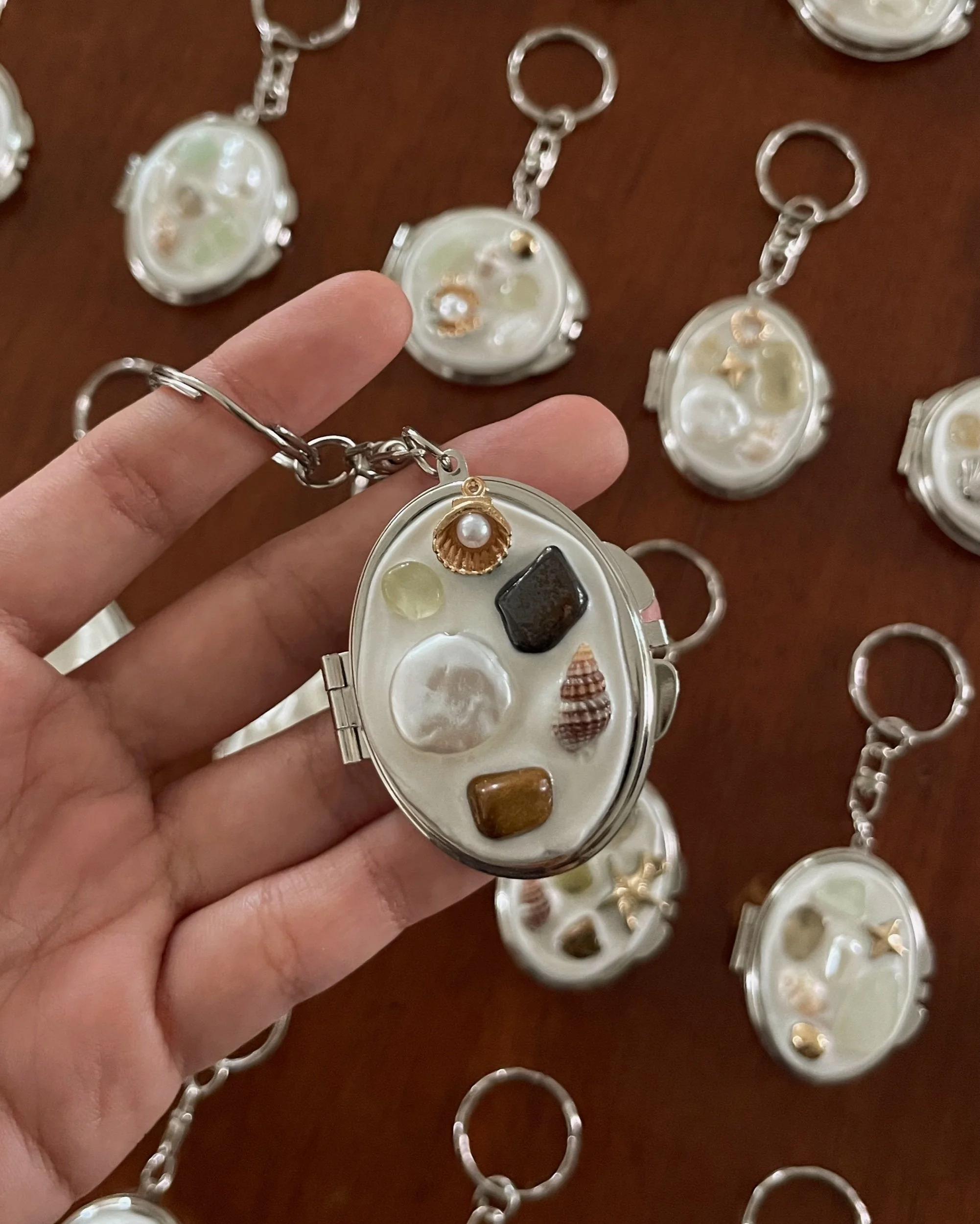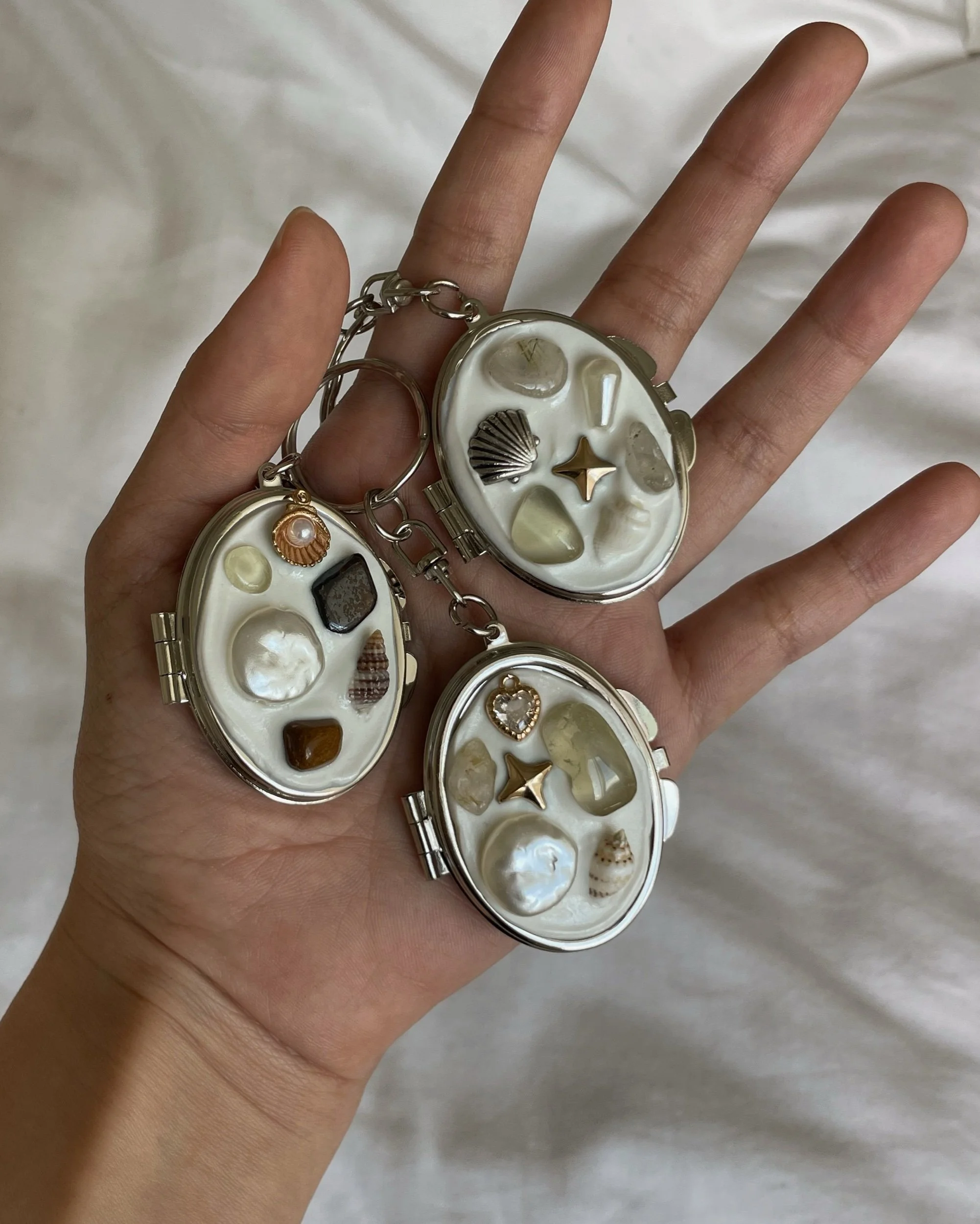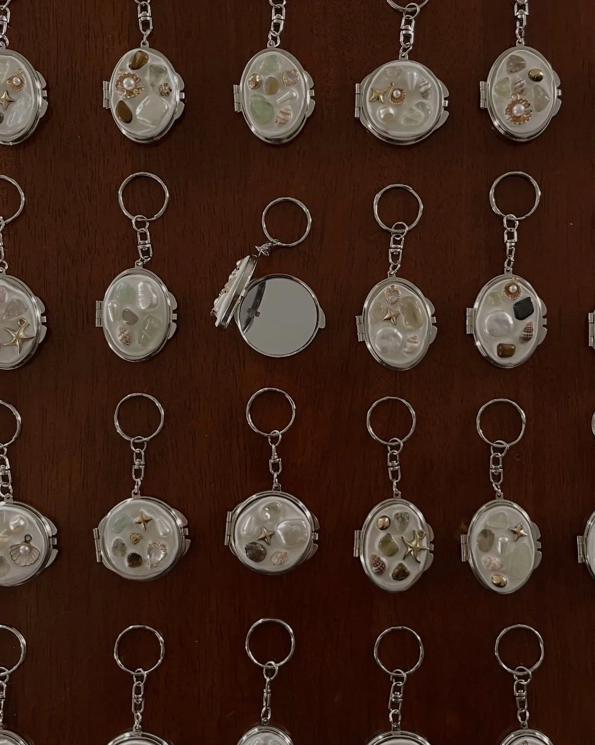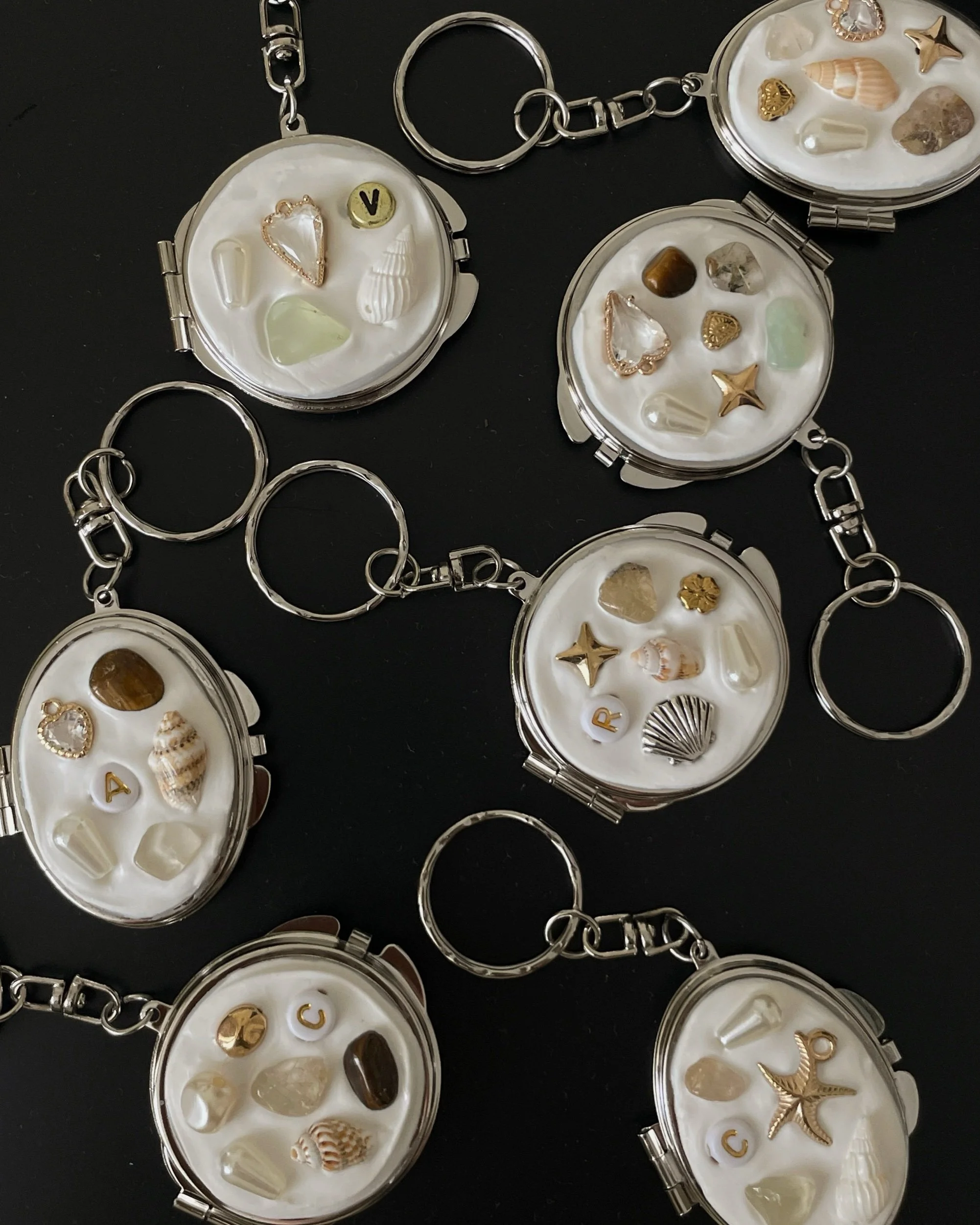 first launched at Boutique Fairs and sold out at our media preview - the mini trinket mirror is your pocket sized pal for on the go touch ups or to add a little something to your every day. features our signature mix of stones and shells on the front and a double mirror on the inside.